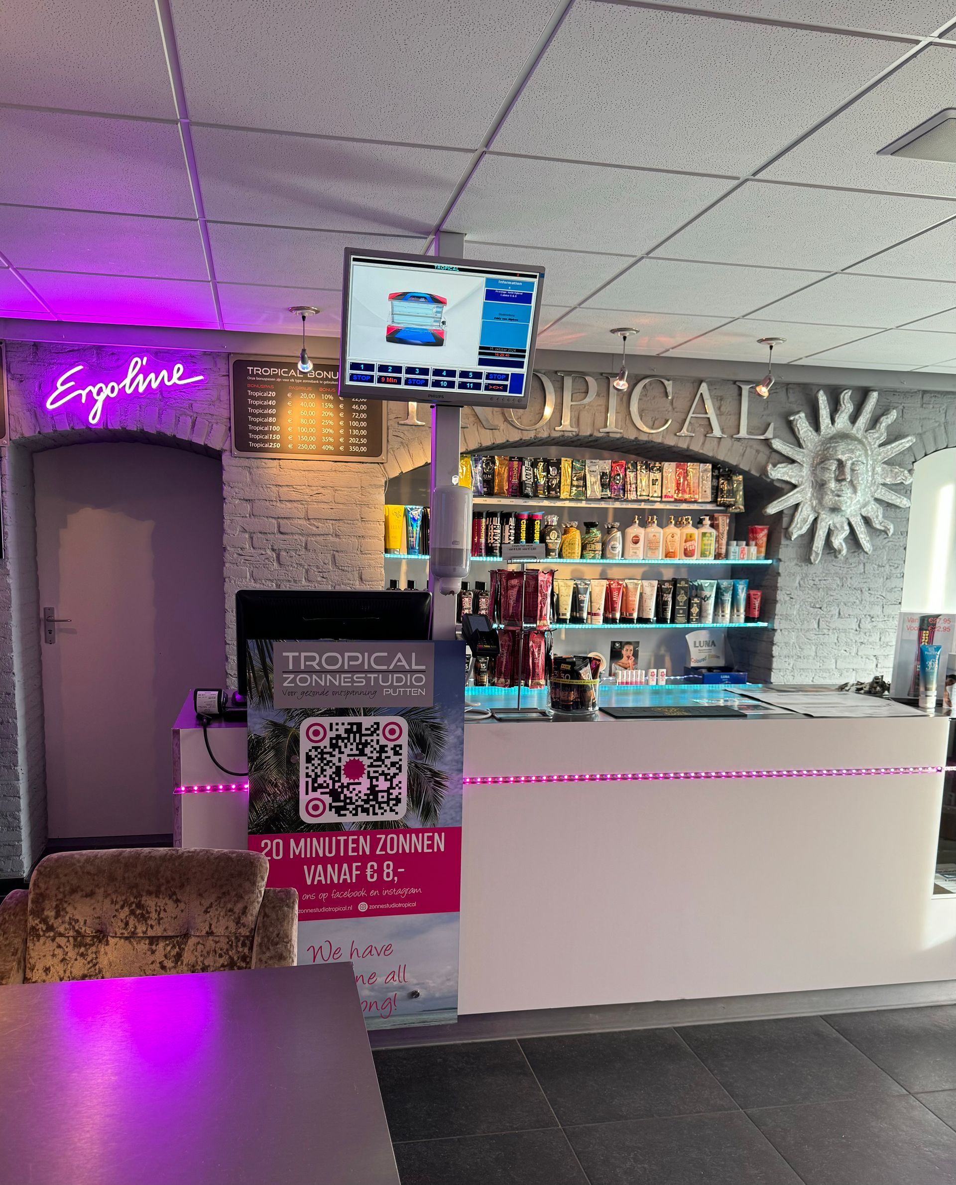 bij ons kan je zonnen onder Ergoline zonnebanken, 20 minuten vanaf € 8,50.